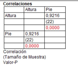 Miremos el cálculo de la correlación entre la variable Pie y la variable Altura en nuestra base de datos: