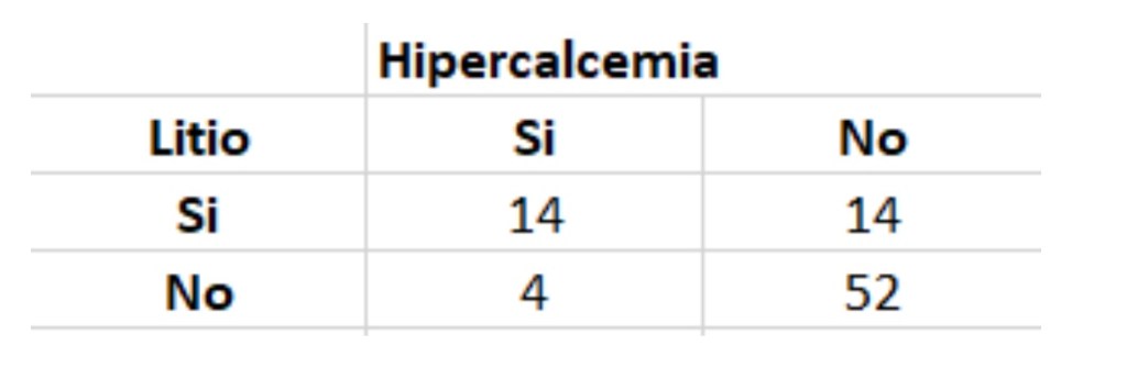 6.En la tabla del ejercicio 1 calcular la Odds ratio, y discutirla, si la exposición fuera no tener el litio elevado y la no exposición tener el litio elevado.