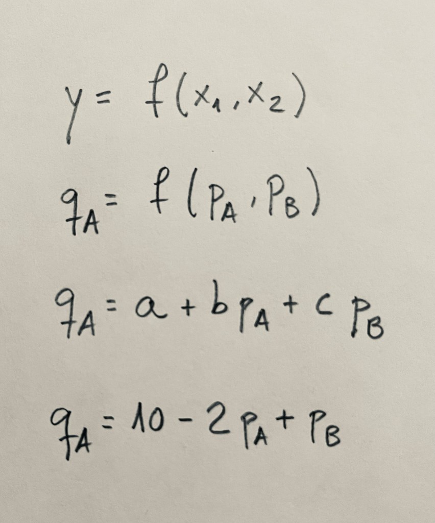 Se trata de la misma función de demanda del producto A expresada, tambíen, en cuatro niveles distintos de abstracción o de concreción, expresada ahora en función del precio de ese mismo producto A y del precio de otro producto B.