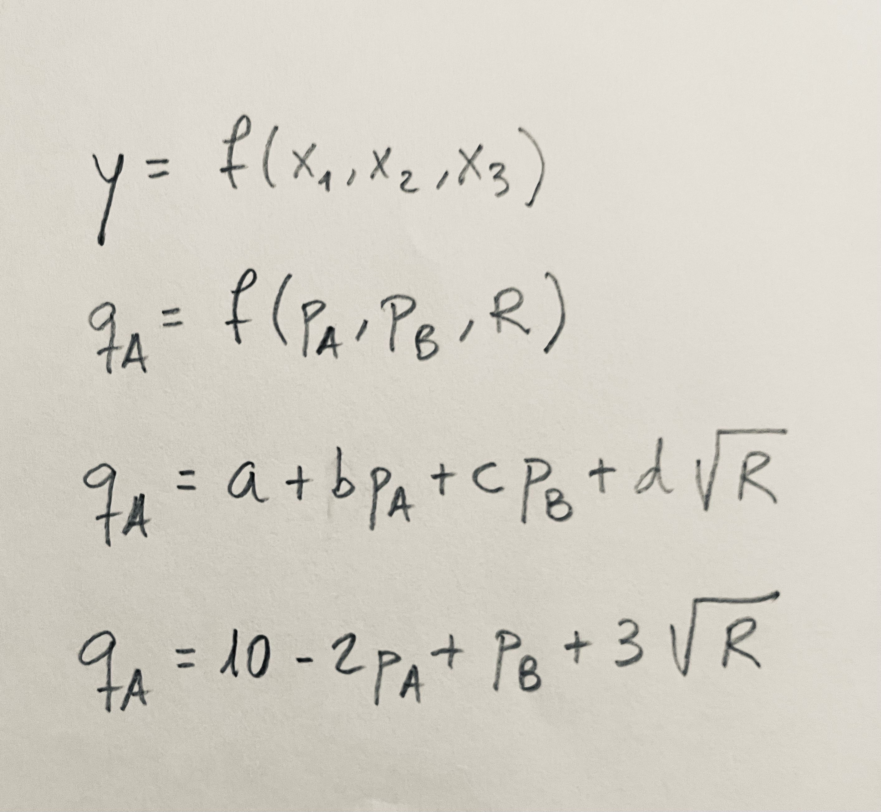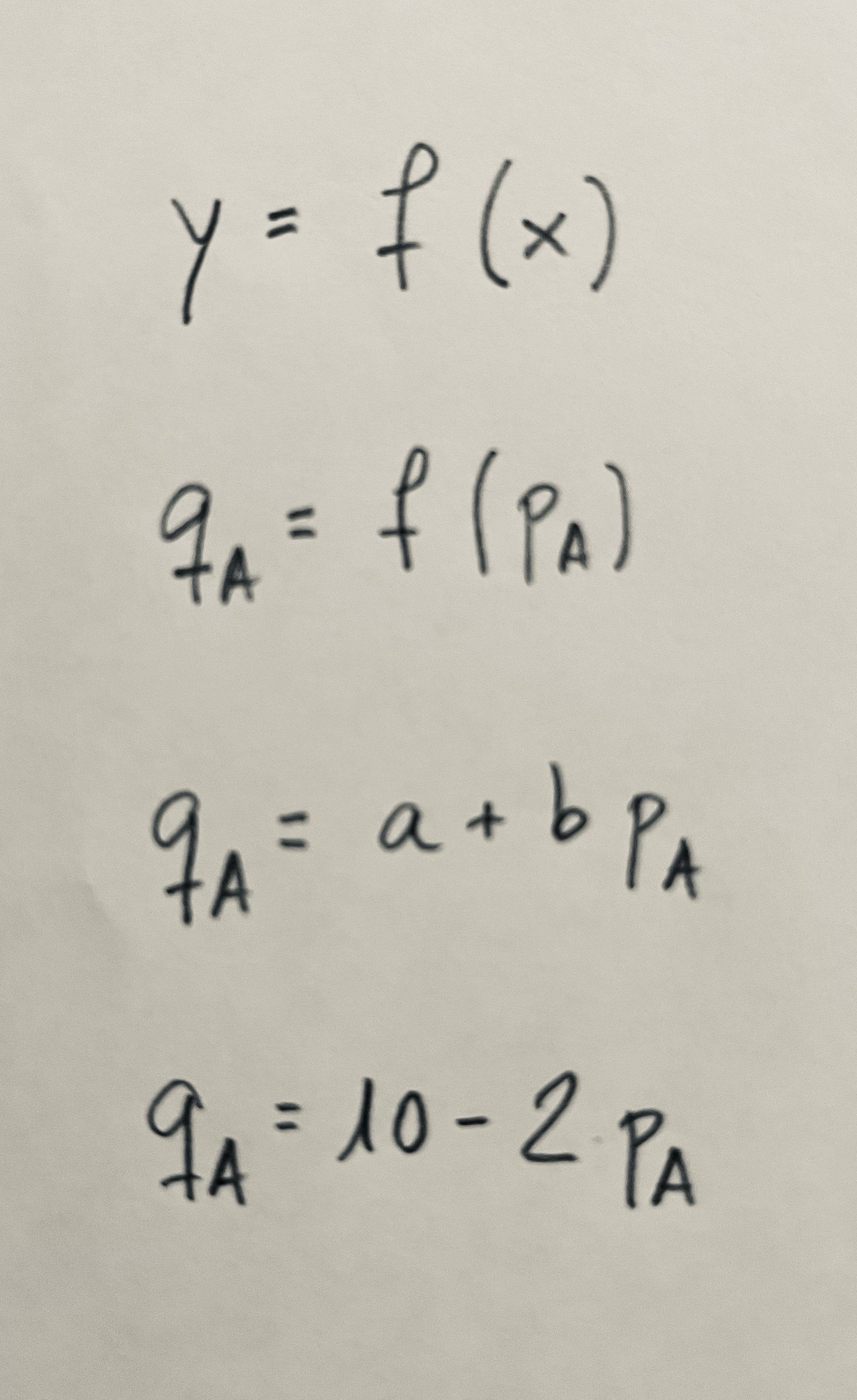 Se trata de una función de demanda de un producto A expresada en cuatro niveles distintos de abstracción o de concreción, expresada únicamente en función del precio de ese mismo producto.