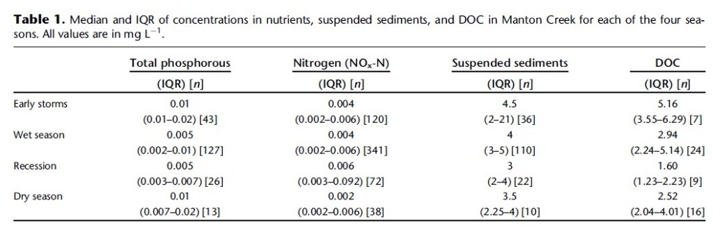 7.En la tabla siguiente, respecto a la variable Total phosphorous y en la Wet season, ¿qué porcentaje de valores muestral tienen un valor por debajo de 0.01?