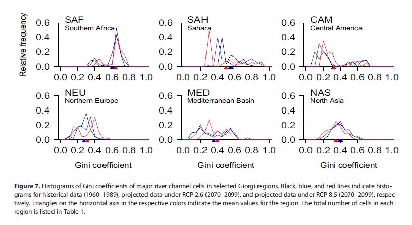 12.En el siguiente gráfico, observando el índice de Gini, ¿en cuál de las tres zonas parece que va a aumentar a lo largo de este siglo la desigualdad en cuanto al caudal de los ríos?