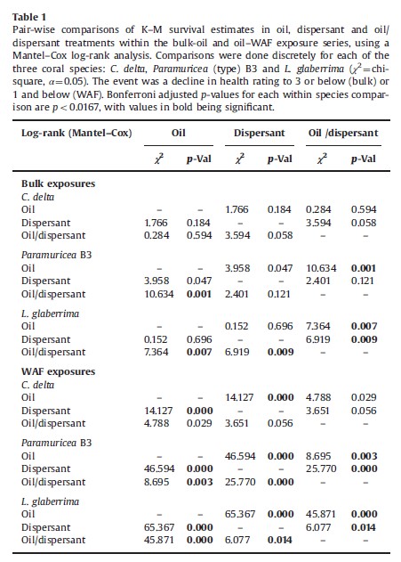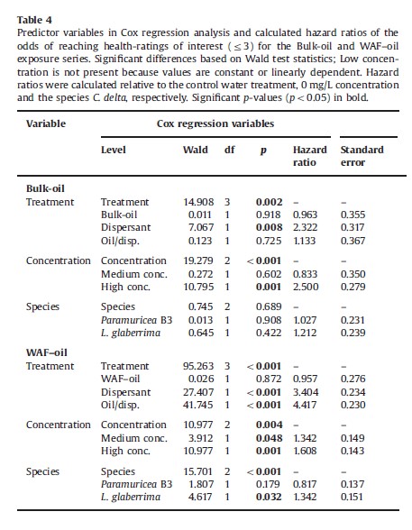 50.En la tabla anterior, ¿cuál sería la HR de Agua marina respecto a Dispersante en Bulk-oil? ¿Y el p-valor?