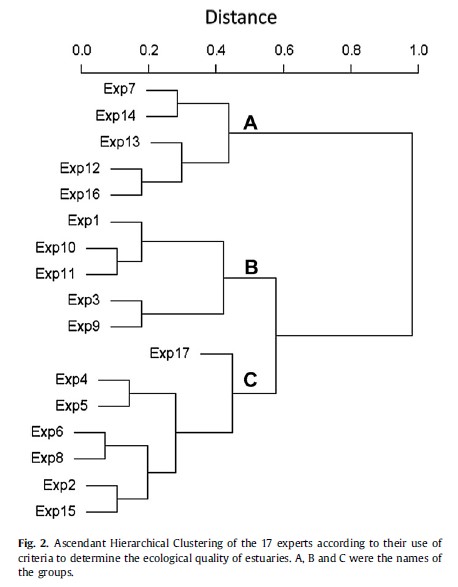 59.A partir del gráfico siguiente en el que se valora la distancia entre distintos expertos a la hora de catalogar distintos sistemas ecológicos marino, si tuviéramos que elegir a cuatro expertos lo más concordados posibles, ¿a cuáles elegiríais?