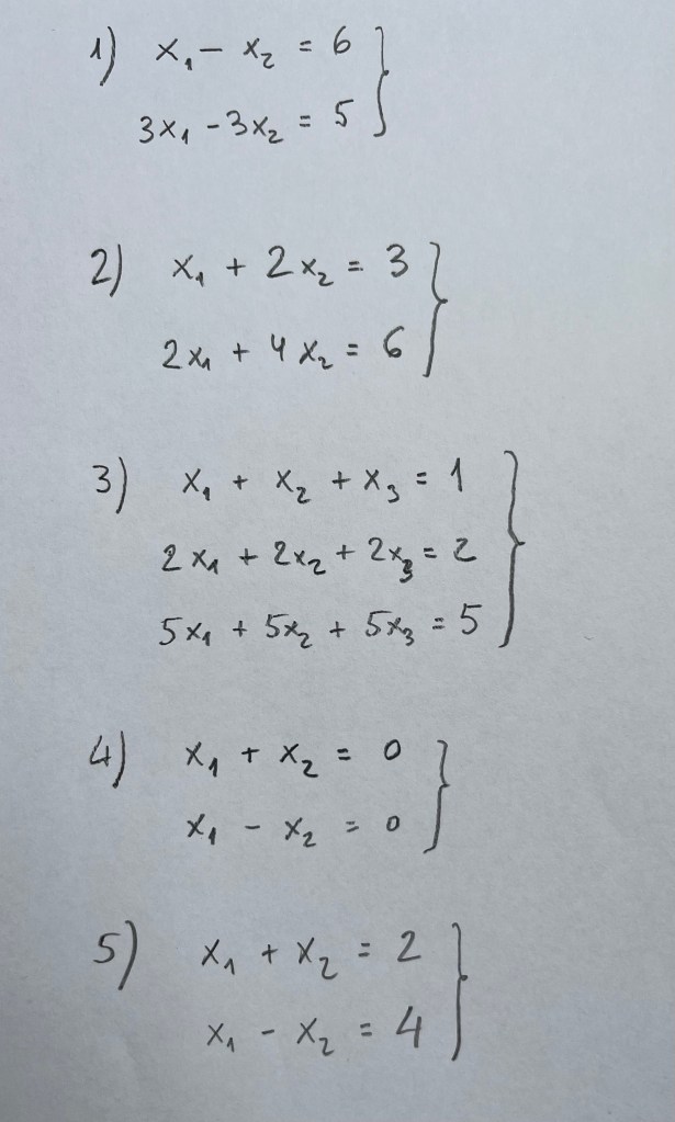 Resolver los siguientes sistemas de ecuaciones tratando de visualizar gráficamente la mayor parte de aspectos que se te ocurran de las funciones que hay detrás de estos sistemas de ecuaciones (en concreto los sistemas 4 y 5 son sobre la misma función vectorial de variable vectorial):