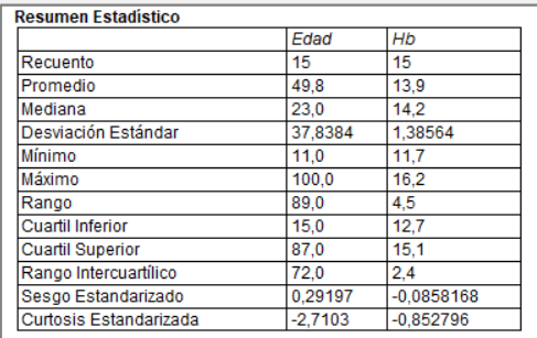 4.Si tenemos una muestra de 15 pacientes con estos valores descriptivos de las variables Edad y Hemoglobina. ¿Cómo las describirías brevemente, con dos o tres números, en una tabla de un artículo científico?