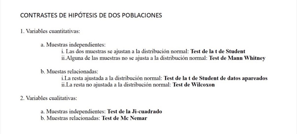 Es muy frecuente en Estadística evaluar si hay diferencia de medias, medianas o proporciones entre una población y un valor de referencia o entre dos poblaciones o entre más de dos poblaciones, en base al análisis de las diferencias que vemos entre las muestras de que dispongamos de esas poblaciones.