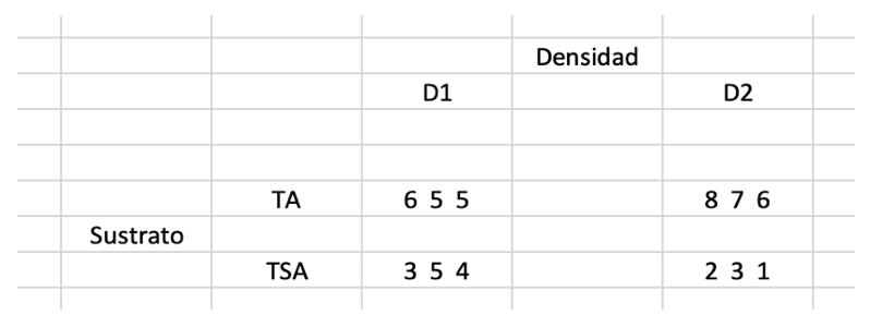 la siguiente tabla de datos, con tres réplicas para ver la variabilidad dentro de los grupos, ¿a qué variable corresponde, a crecimiento o a supervivencia? Justifica la respuesta.