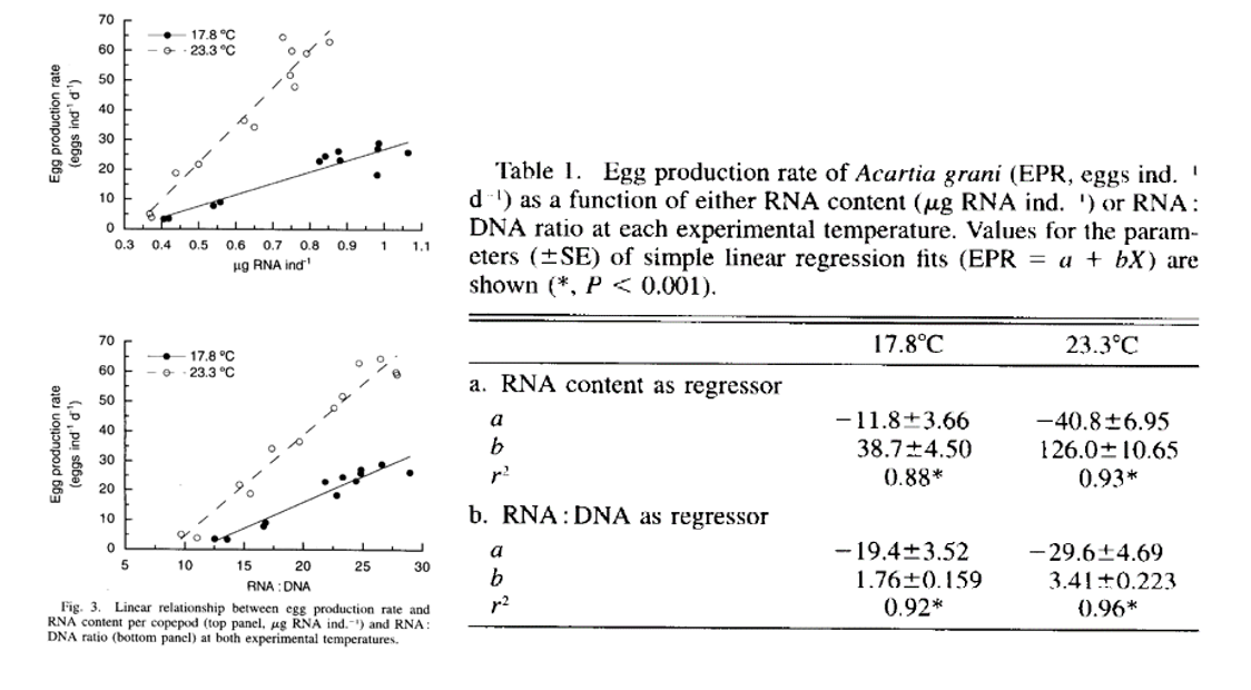 8. El estudio que se presenta a continuación utiliza la regresión lineal simple con la finalidad de relacionar la producción de huevos en copépodos con la cantidad de RNA por un lado y con la proporción RNA/DNA por otro.