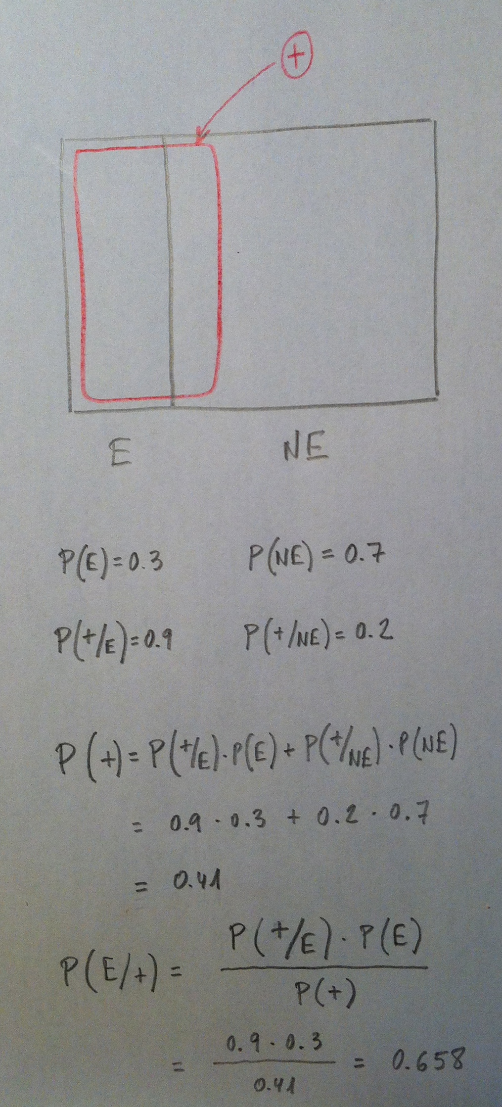 Supongamos que estamos estudiando una enfermedad en una población que sabemos que tiene una prevalencia de 0.3 (o, en porcentaje, del 30%). La población queda partida en dos grupos: Enfermos (E) y No enfermos (NE). La probabilidad de E es 0.3 y la de NE es 0.7. Supongamos también que podemos aplicar una técnica diagnóstica para ver si una persona tiene o no tiene esa enfermedad. Supongamos que sabemos la probabilidad de que la prueba dé positiva (+) si una persona tiene la enfermedad; o sea, la P(+/E) y que también sabemos la probabilidad de que la prueba dé positiva si una persona no tiene la enfermedad; o sea, la P(+/NE). Si quisiéramos sabe la probabilidad de que cogiendo una persona al azar en esa población la prueba diera positiva; o sea, la P(+) deberíamos aplicar el Teorema de las probabilidades totales. Si lo que nos planteáramos fuera saber que sabiendo que ha dado positiva la prueba en una persona calcular la probabilidad de que sea una persona con la enfermedad; o sea, P(E/+) deberíamos aplicar el Teorema de Bayes. Veámoslo: