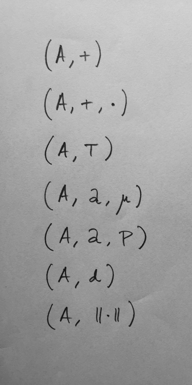 Cada uno de ellos apunta a una estructura, a una mirada distinta a ese mismo conjunto A. Aparecen operaciones (+, •). A veces una operación, a veces dos operaciones. Aparecen topologías (T), clases de subconjuntos (a), medidas (μ), probabilidades (P), distancias (d), normas (⎢•⎢).