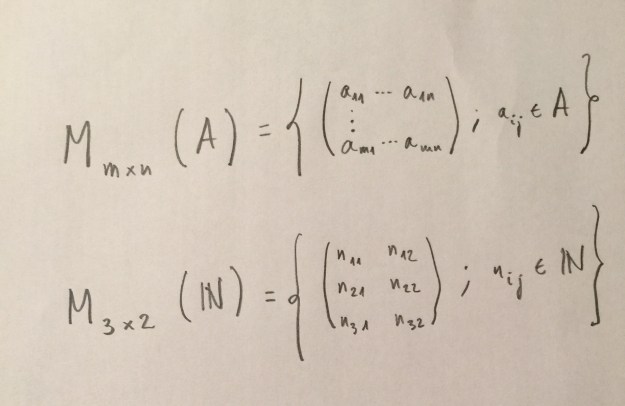 El conjunto que se sitúa entre paréntesis representa el conjunto del que se toman elementos para ir llenando las distintas posiciones de la matriz. El primer conjunto de matrices que aparece en la anterior imagen es una expresión completamente general: m filas y n columnas y el conjunto A, entre paréntesis, es una expresión general de cualquier conjunto. El segundo conjunto de matrices ya es un caso concreto: El conjunto de matrices con 3 filas y dos columnas de formadas por números naturales.