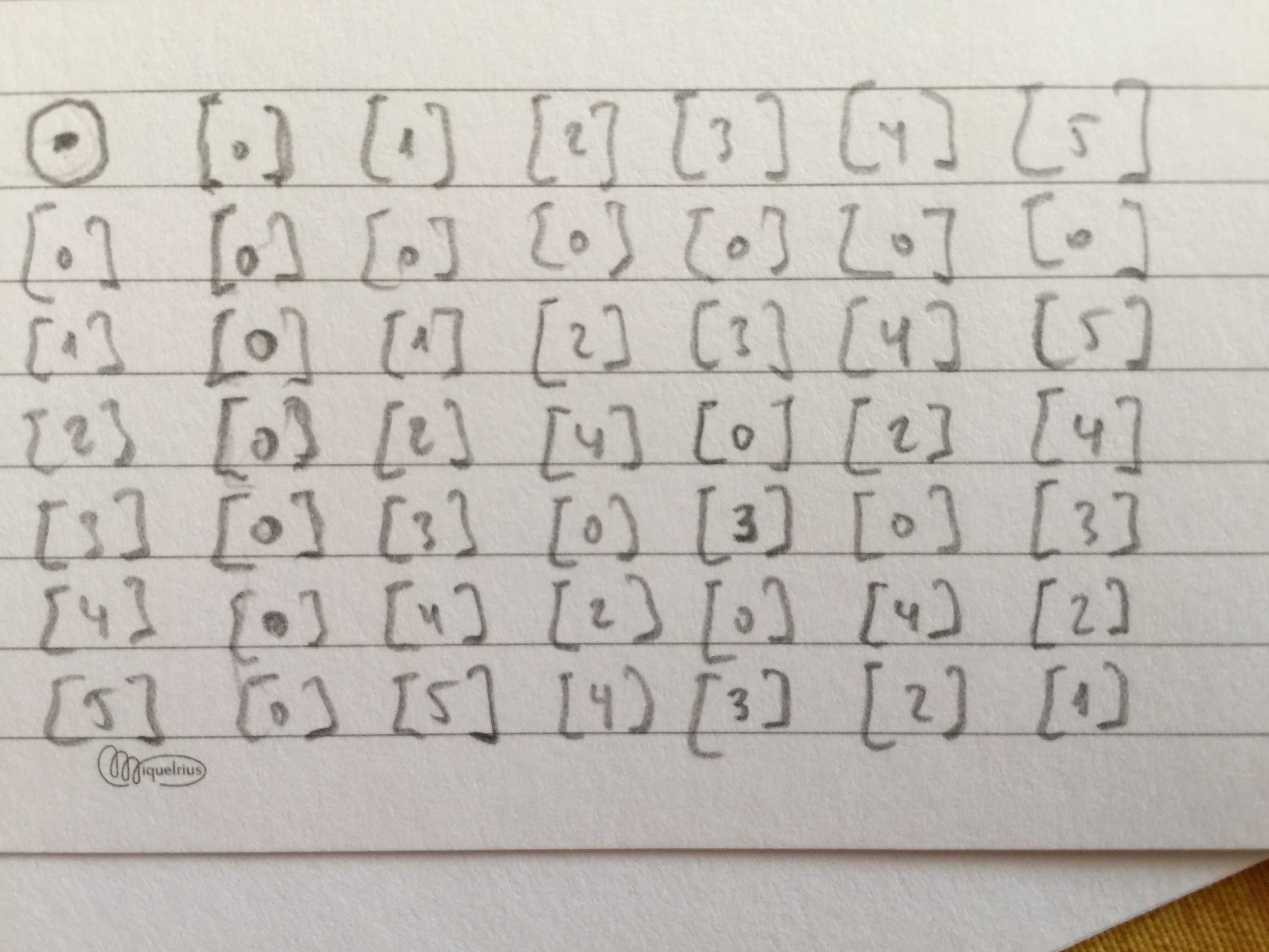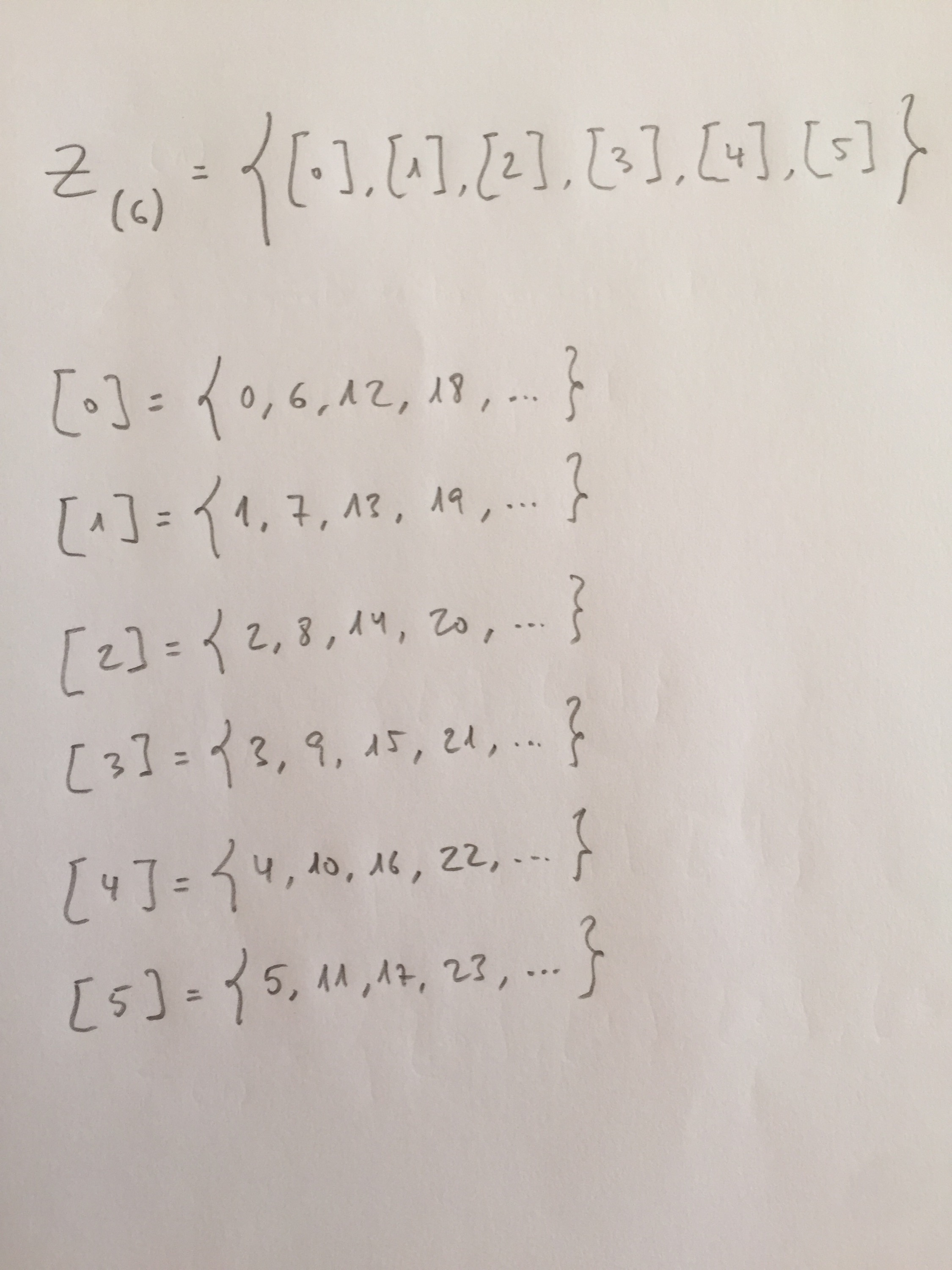 Por ejemplo, un miembro cualquiera de la clase [2] multiplicado por uno de la clase [3] nos dará un número miembro de la clase [0]. Podéis comprobarlo. Obtendremos siempre un múltiplo de 6, lo que nos lleva a un número de la clase [0], en este conjunto.