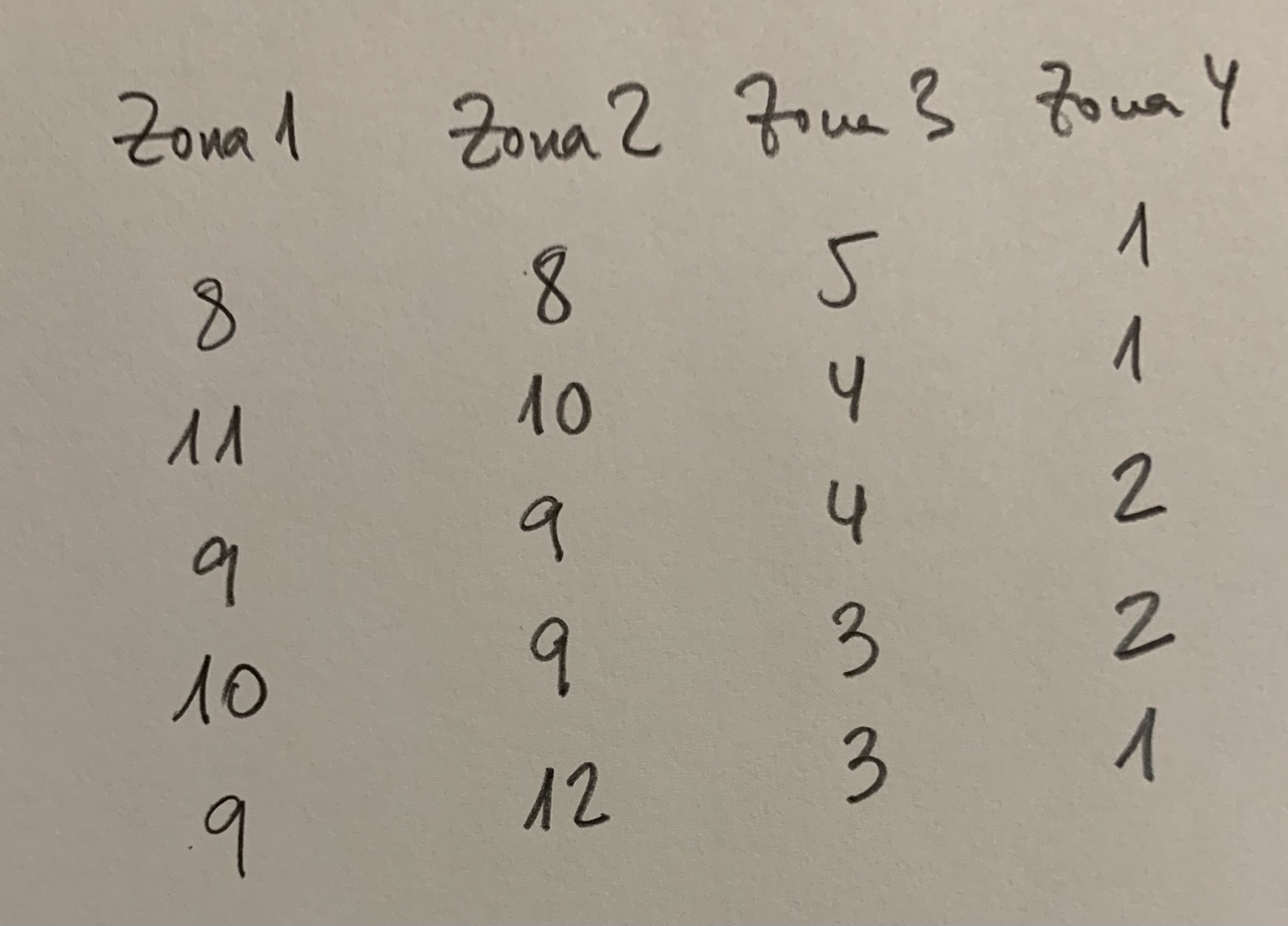 15)Tenemos la siguiente tabla de resultados en un estudio donde comparamos la cantidad de ejemplares de una especie de pez en cuatro zonas concretas del mediterráneo. En cada zona se toma una muestra de tamaño 5. Los resultados, en cuanto al número de ejemplares de esa especie de pez contadas en cada muestra y zona, son los siguientes: