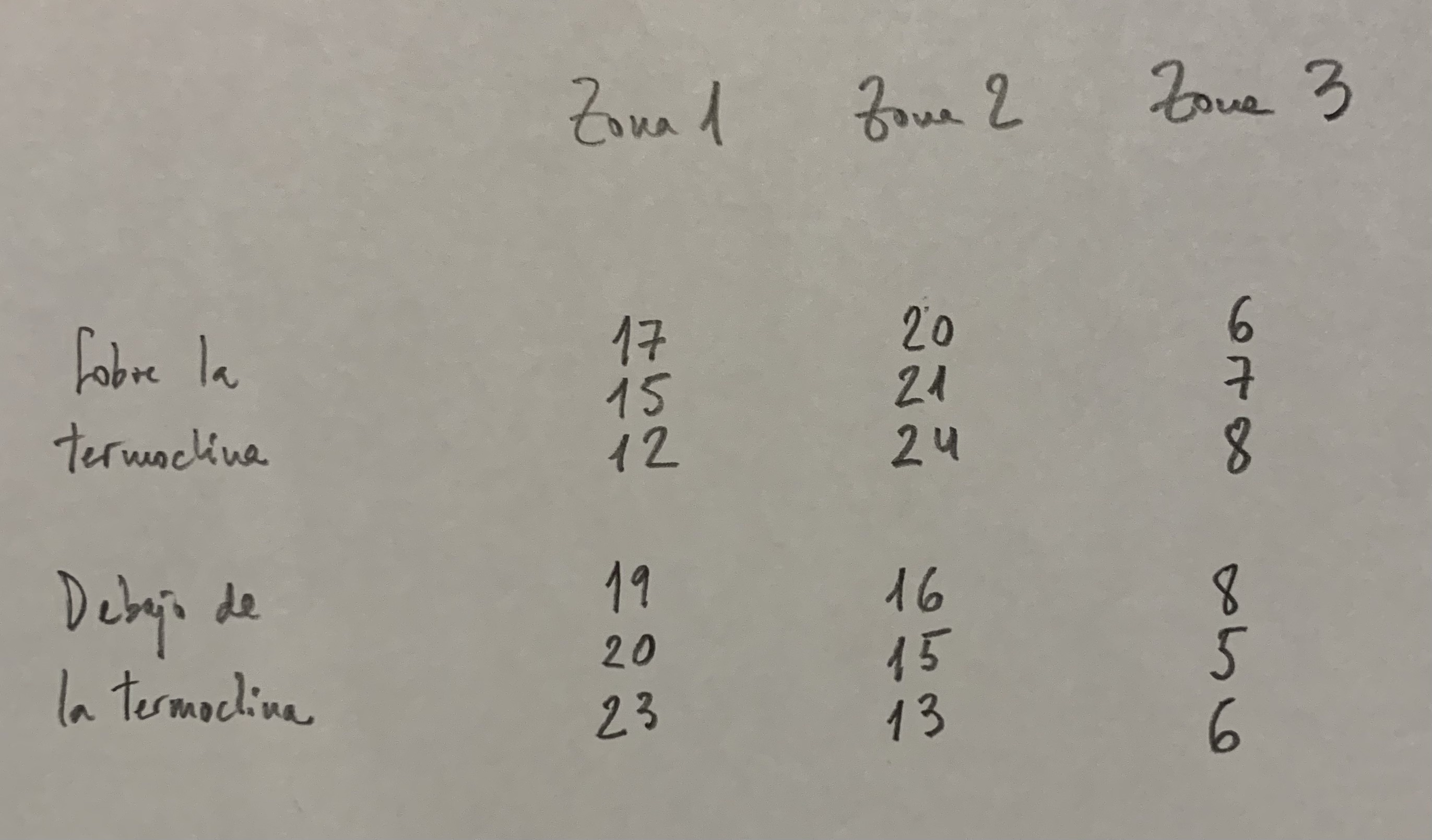 16)Tenemos la siguiente tabla de resultados en un estudio donde comparamos el porcentaje de una especie de zooplancton en tres zonas concretas del mediterráneo. También, en cada zona, se ha diferenciado entre muestras tomadas sobre la termoclina o por debajo de ella. Los resultados de porcentaje obtenidos son los siguientes:
