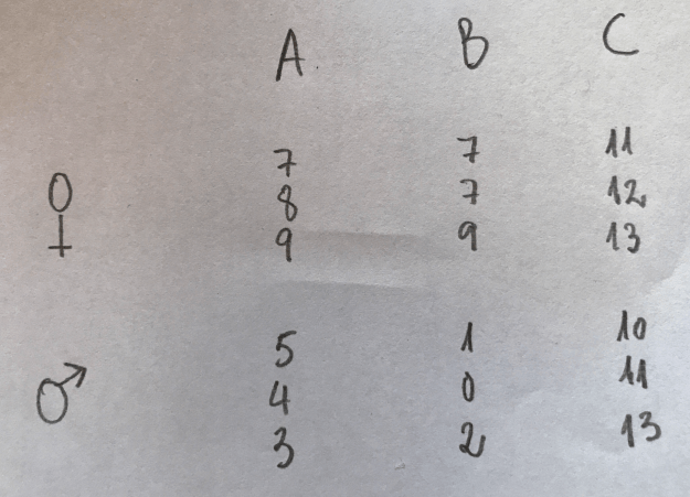 12.Tenemos los siguientes datos en un estudio donde se aplican tres medicamentos distintos (A, B y C) a un grupo de pacientes que tienen una determinada patología y que se han diferenciado en hombres y mujeres. Con los datos obtenidos se pretende ver la diferencia entre tratamientos, entre sexos y si hay o no interacción. ¿Cuál es la afirmación más razonable respecto a los resultados que podríamos obtener en el ANOVA?: