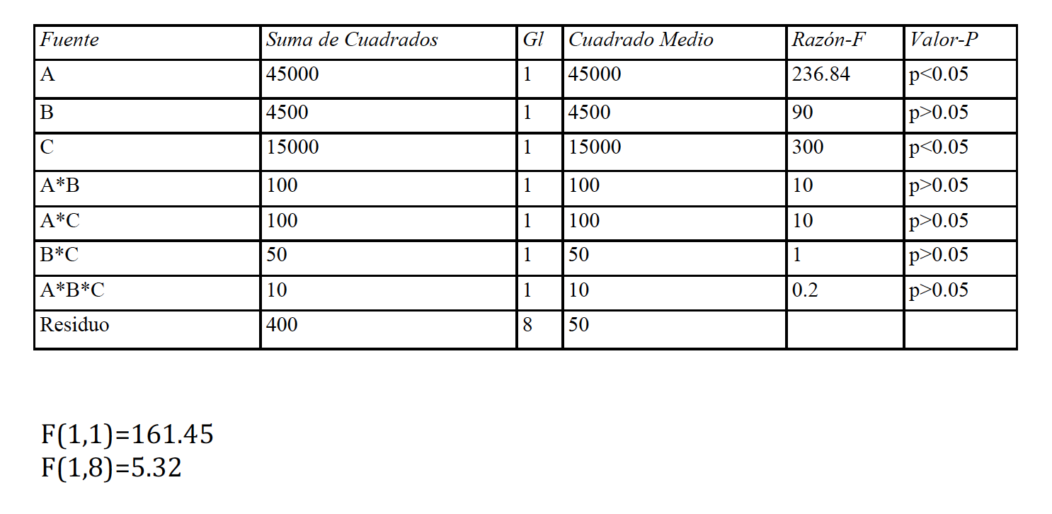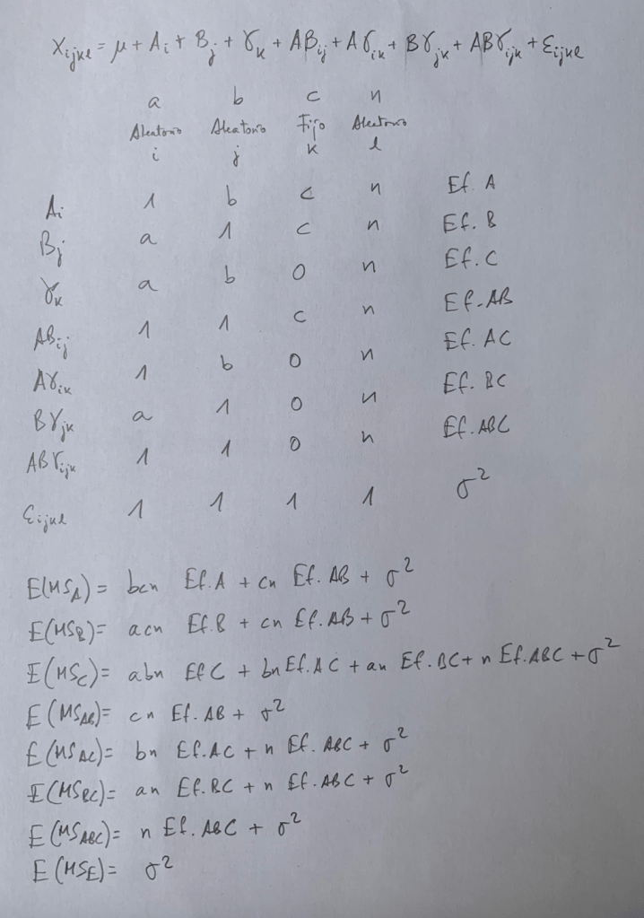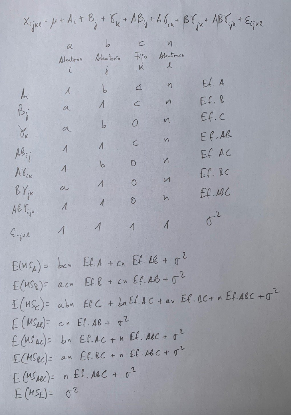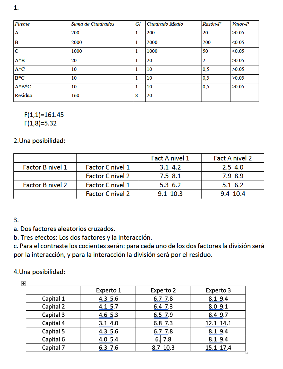 2. Tenemos un modelo de tres factores (A, B y C). El factor A es fijo y los factores B y C son aleatorios. Los tres factores están cruzados. Completar la tabla:
