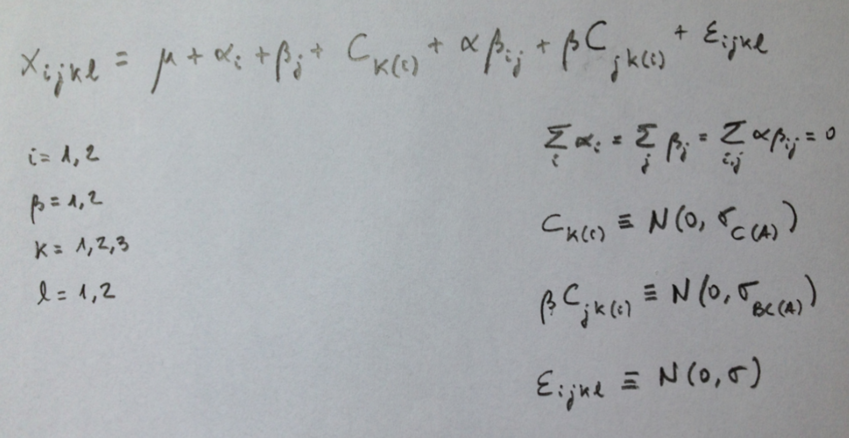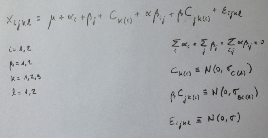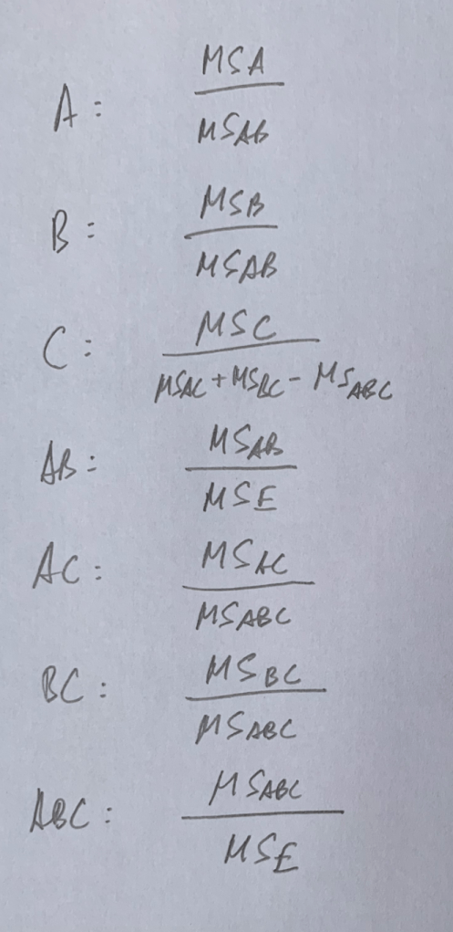 Pero, cuidado, porque, en este modelo, los factores aleatorios son el A y el B, pero en nuestro problema son el B y el C. Lo que le sucede, pues, al A y al B en este modelo es lo que les sucede al B y al C en nuestro problema. Y lo que le sucede al C en el modelo es lo que le sucede al A en nuestro problema. Por lo tanto, los cocientes son los que veis en la solución.