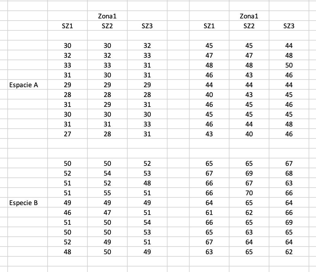 c. Construye unos datos factibles con el resultado en el que sean significativos tanto el factor zona como el factor especie pero que el factor subzona no sea significativo.