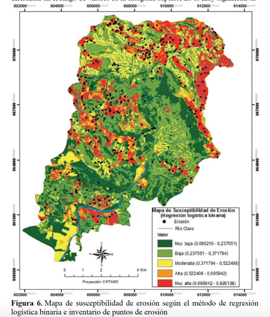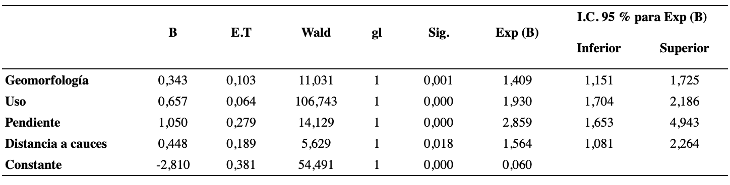 4.En un estudio de susceptibilidad a la erosión en una cuenca hidrográfica (https://www.revistas.una.ac.cr/index.php/ambientales/article/view/10110/12576) se han buscado los elementos que condicionan esa susceptibilidad mediante un análisis de regresión logística múltiple. Los resultados de esta análisis son los siguientes: