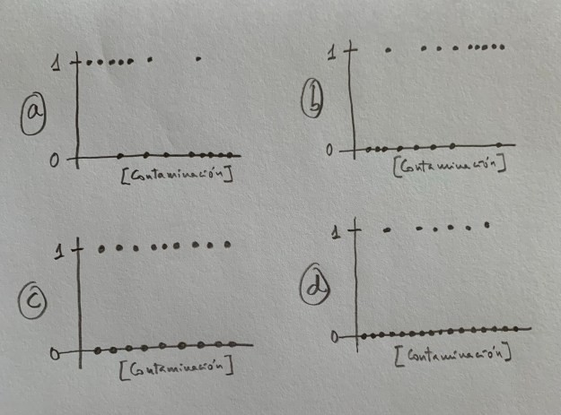 1.Se quiere ver la relación entre el nivel de un contaminante ambiental y la viabilidad o no viabilidad al cabo de un año en ejemplares de una especie determinada. ¿Cuál de las siguientes curvas de regresión logística indicarían un mayor efecto de los niveles progresivamente altos de contaminación sobre la no viabilidad? (Viabilidad=0; No viabilidad=1):