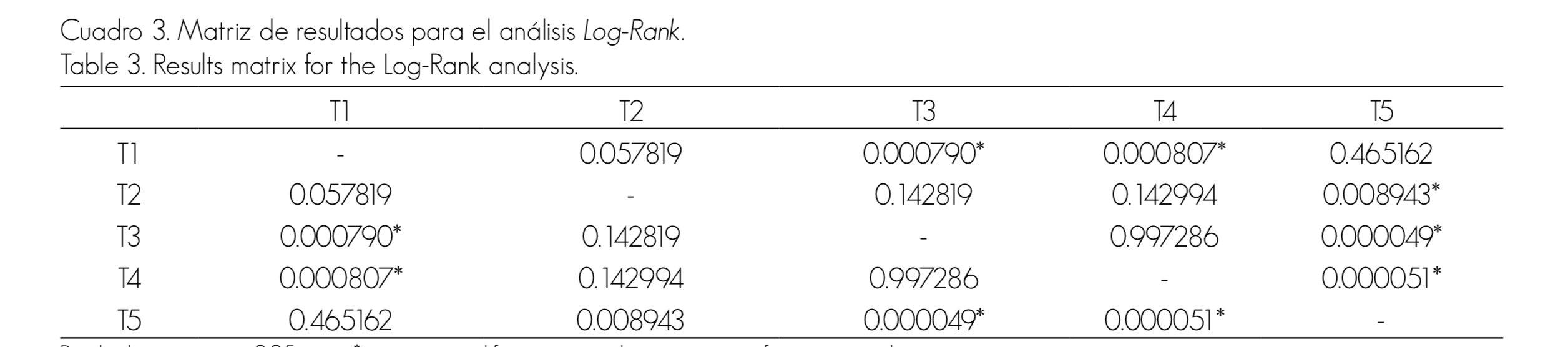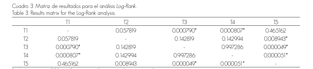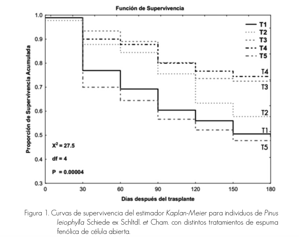 10.Se ha realizado un estudio de supervivencia de Pinus leiophylla en cinco tratamientos distintos. También se ha realizado el Log-Rank test dos a dos entre las curvas de los diferentes tratamientos.