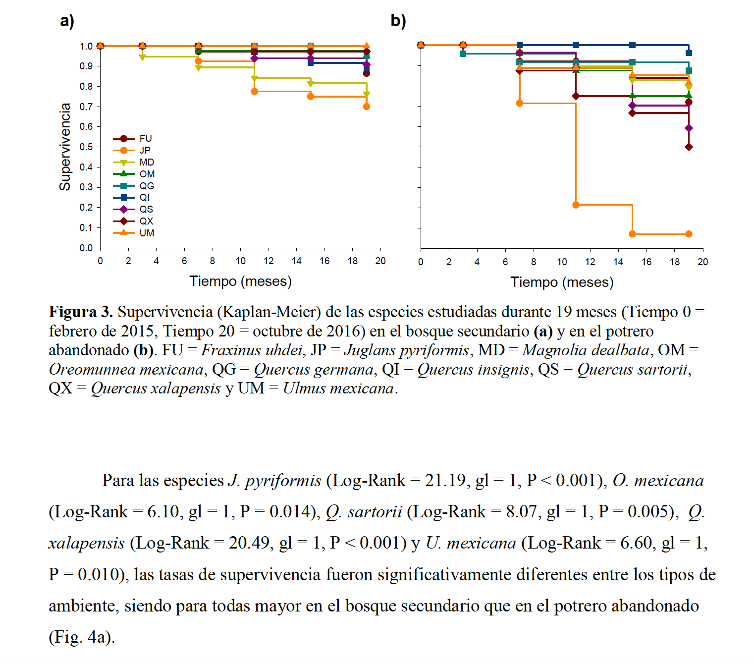 a.Todas las especies muestran diferencias estadísticamente significativas entre las curvas de supervivencia cuando se comparan los dos ámbitos de crecimiento.