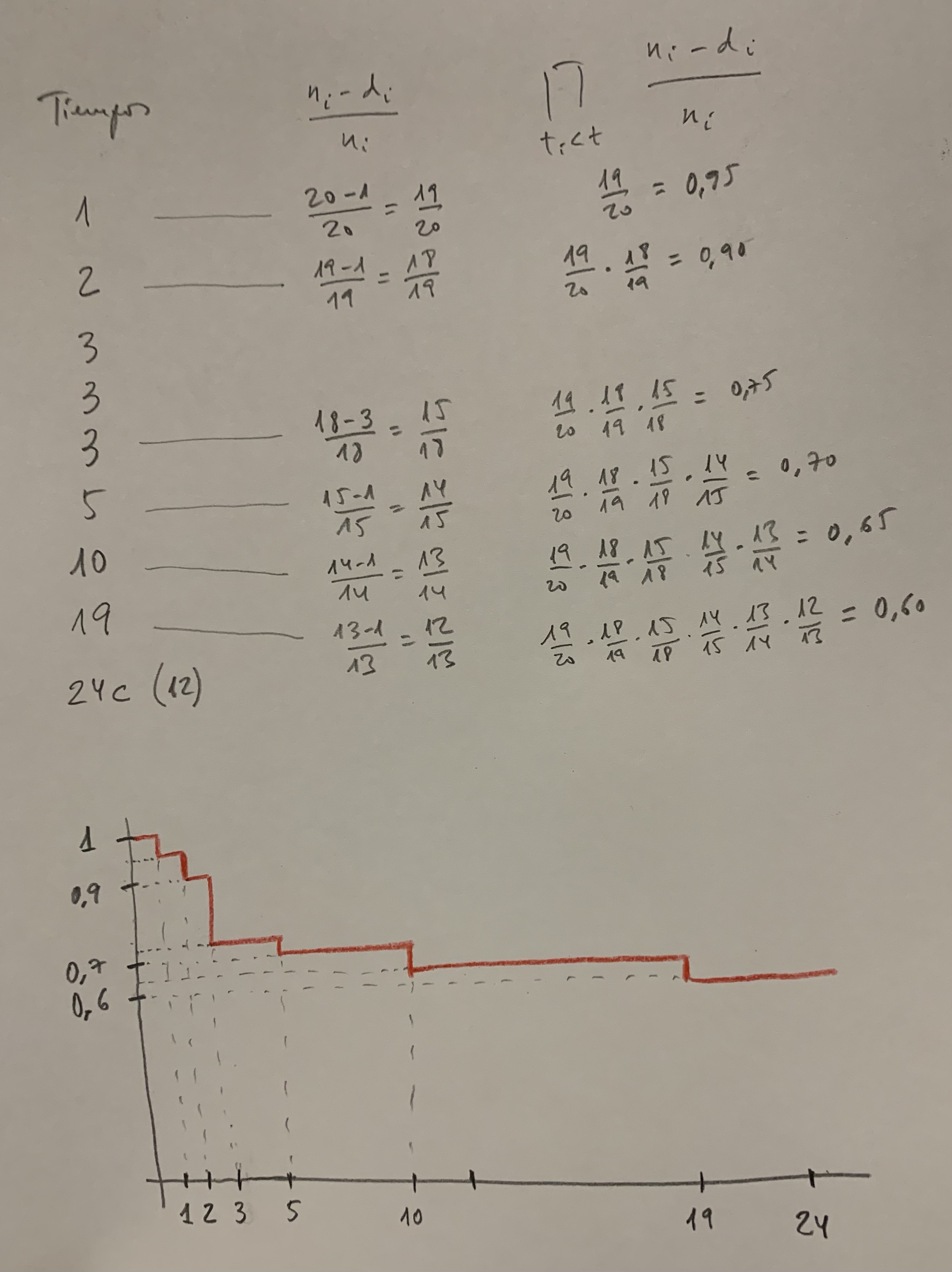 1.Construir el estimador Kaplan-Meier de la siguiente muestra de tiempos de muerte de árboles reimplantados en una zona previamente quemada, en un seguimiento hasta 24 meses. Los 24c indica que al final del estudio estaban en situación de viabilidad: