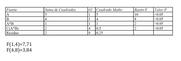 d.En un ANOVA de un factor con siete niveles, donde tenemos un p-valor inferior a 0.05, como mínimo encontraremos que uno de los niveles es distinto a los demás.